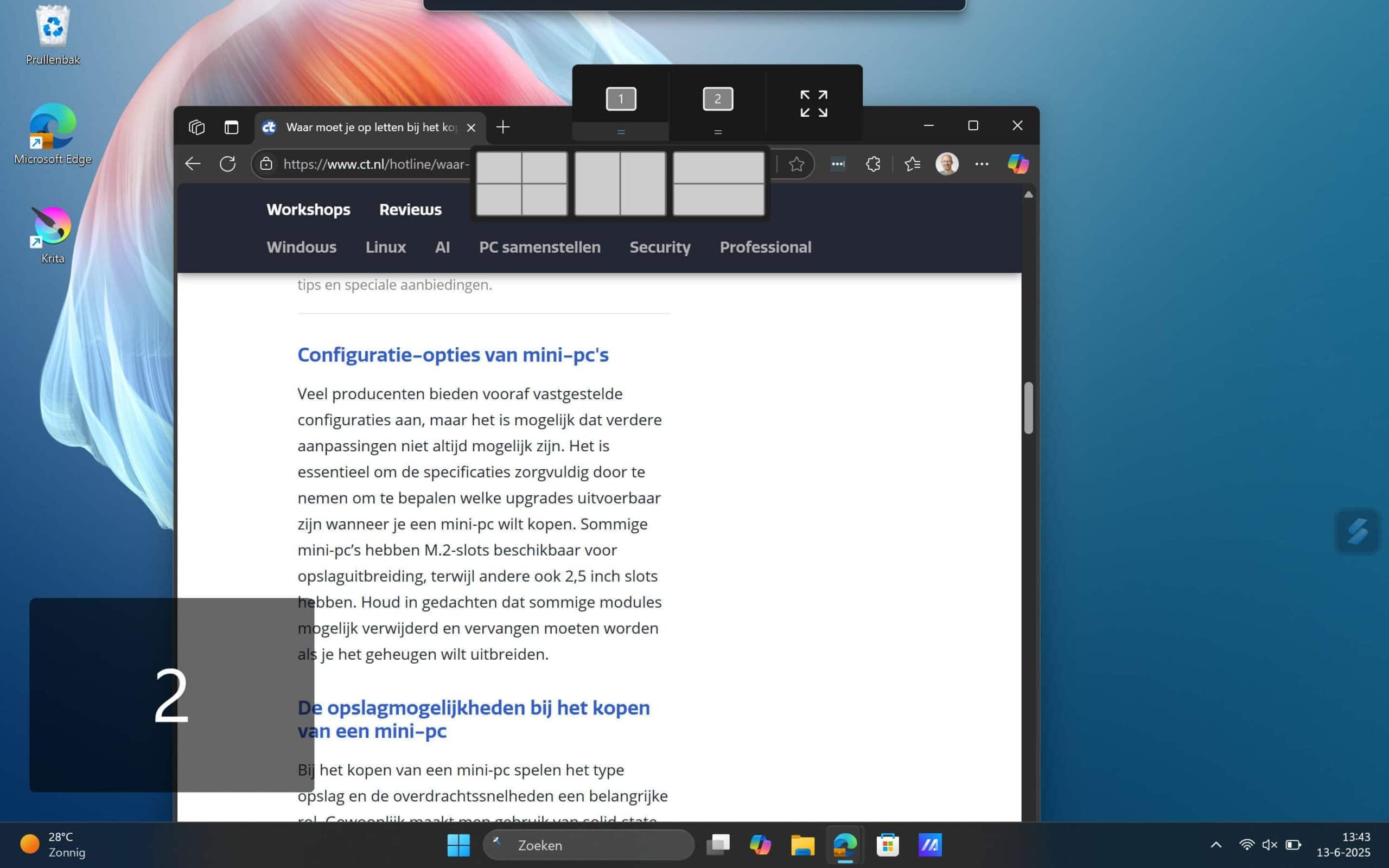 Wie gewend is aan de standaard sneltoetsen en snap-functies van Windows kan die ook op de ZenBook Duo benutten. Asus voegt met de gratis ScreenXpert-software extra mogelijkheden toe. Zo verschijnt bij het slepen van vensters een widget om ze snel naar een bepaald scherm of een specifieke lay-out te verplaatsen. Je kunt bovendien eigen lay-outs met programmavensters definiëren en als taakgroepen opslaan.