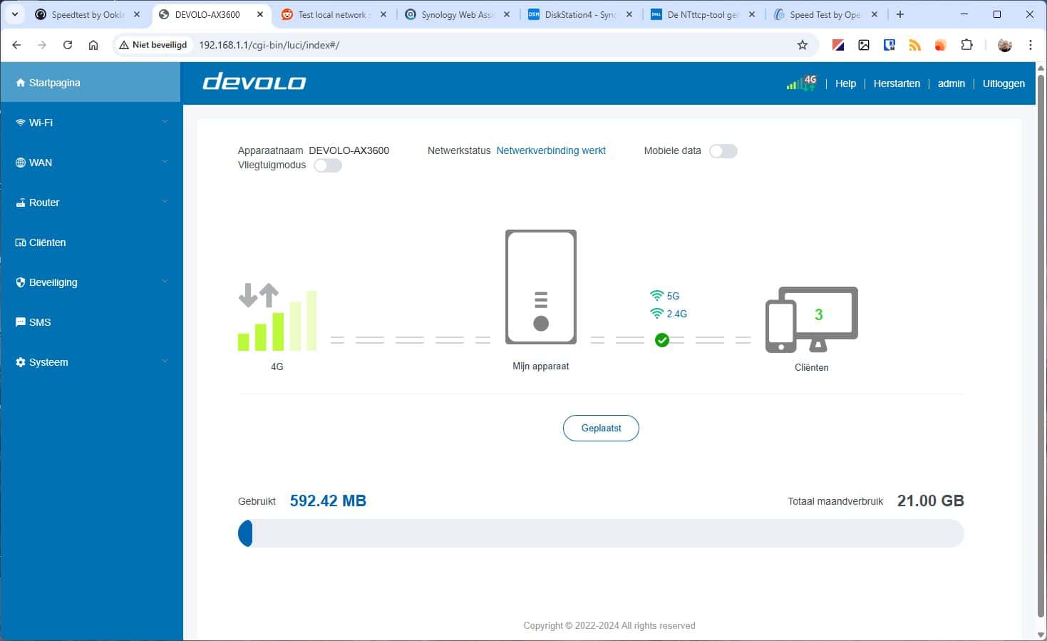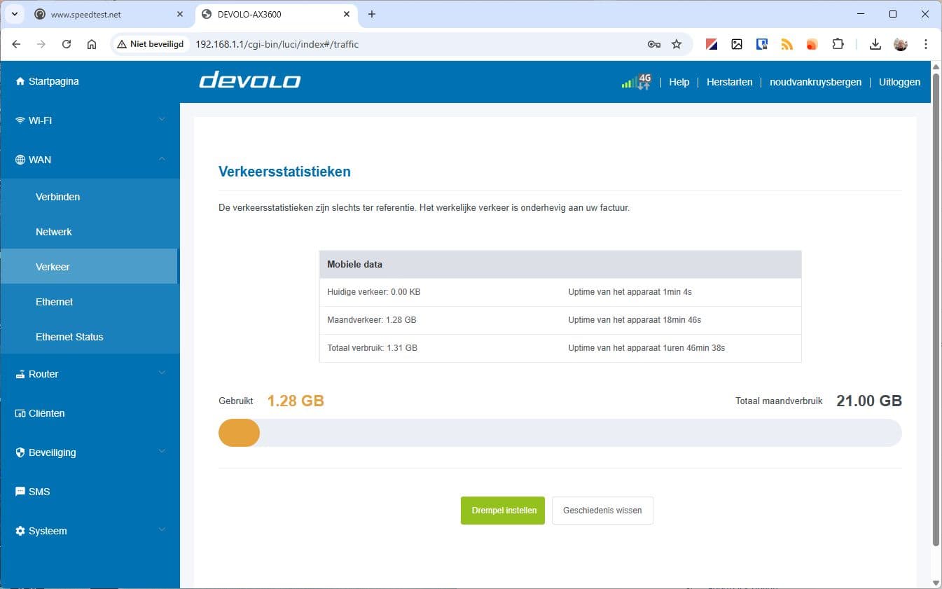 De mobiele verbinding staat standaard ingesteld op NSA+SA, oftewel 4G en 5G. Op de Startpagina van de webinterface kun je zien hoe snel de momentane verbinding is en hoeveel MB je tot dan toe verbruikt hebt. Bij ‘WAN / verkeer’ kun je via ‘Drempel instellen’ de grootte opgeven voor een eventuele databundel. Dat kan alleen per maand, dus niet per dag – wat voor ons KPN SuperUnlimited+-abonnement met 21 GB per dag handiger zou zijn.
