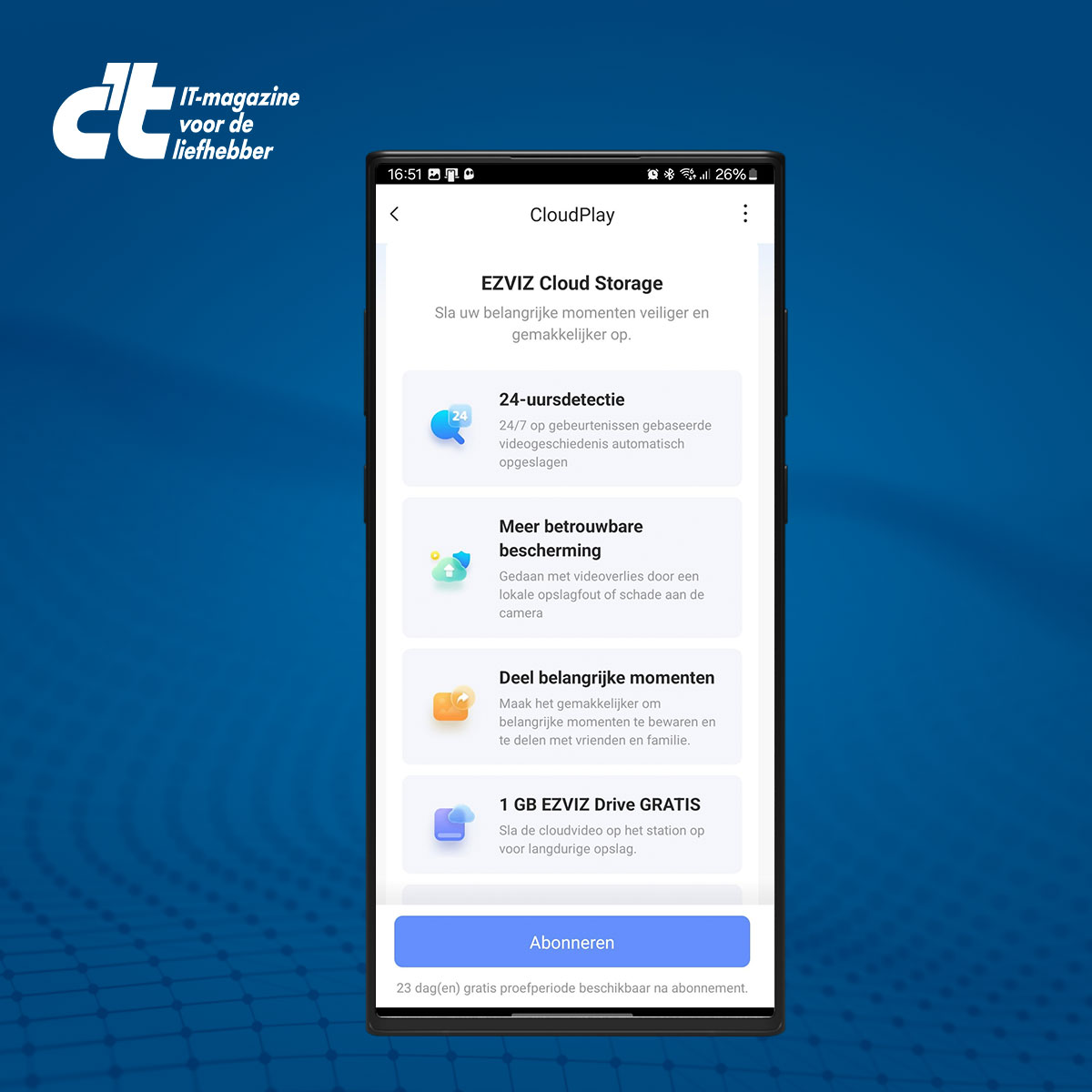 Daarnaast kun je ervoor kiezen om een cloudabonnement (bekend als CloudPlay in de app) af te sluiten via de EZVIZ-app, maar dit is niet verplicht aangezien er al 28GB aan lokale opslag beschikbaar is.