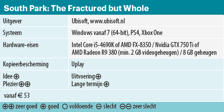 South Park …de melige foute humor is je ding, of totaal niet: een tussenweg is er niet. In South Park: The Fractured but Whole, de opvolger van South Park: The Stick of Truth, word je weer behoorlijk overspoeld door de foute herkenbare humor uit de welbekende animatieserie. Karakters van DC, Marvel maar ook South Park zelf en beroemde personen worden lekker op de hak genomen. Allerlei al dan niet actuele thema’s passeren de revue.