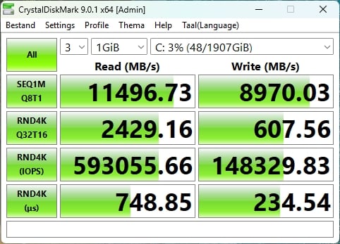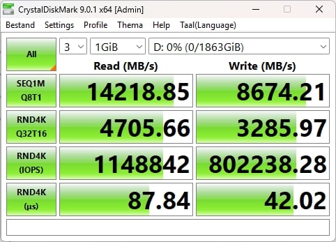 Met CrystalDiskMark 9 kwamen we tot lees- en schrijfsnelheden van 14.218 en 8.674 MB/s met IOPS-waarden van 1,15M en 0,80M. Uit die snelheden en uit de informatie die we kregen met HWiNFO blijkt dat de M.2-ssd niet alleen Gen5-ready is, maar dat ook echt al is – al blijft dat qua schrijven wat achter bij eerdere tests met deze zelfde ssd.