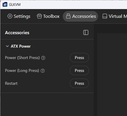 Bij het menu-item Accessories verschijnt daarna onder ATX Power de mogelijkheid om een korte of lange knopdruk te simuleren of een herstart uit te voeren. Mocht een computer crashen of gewoon uitstaan, dan heb je met andere remote software geen andere mogelijkheid dan je fysiek naar de pc te begeven. Met de combinatie van de Comet en het ATX Board kun je de pc echter ook op afstand semi-fysiek bedienen.