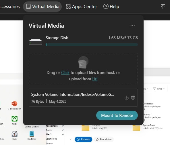Bij de optie Virtual Media blijkt dat er in de Comet 6 GB aan opslagruimte zit die je kunt gebruiken om bestanden uit te wisselen. Met Mount To Remote koppel je die als extern medium aan het remote besturingssysteem. Ben je daar klaar mee, dan moet je hem weer uitwerpen in dat systeem en bij Virtual Media op Stop Sharing klikken. Je kunt de bestanden daar vervolgens naar je laptop downloaden. Je kunt ook de omgekeerde weg bewandelen door eerst bestanden aan deze kant te uploaden naar de Comet-opslag en die daarna remote toegankelijk te maken.