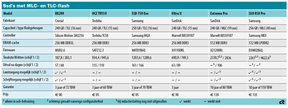 Tot zover de theorie. Ons interesseerde uiteindelijk hoelang veel verkochte ssd’s van dit moment het in de praktijk uithouden. We hebben steeds twee exemplaren van de volgende TLC-schijven gekocht: Crucial BX200, Toshiba OCZ TR150, Samsung SSD 750 Evo en SanDisk Ultra II. Hetzelfde geldt voor de duurdere MLC- ssd’s Samsung SSD 850 Pro en SanDisk Extreme Pro (ca. 250 GB). We bouwden steeds drie schijven bij een Windows-systeem in dat van een normale schijf opstartte. Alle ssd’s werkten met de firmware die bij het begin van de test actueel was.
