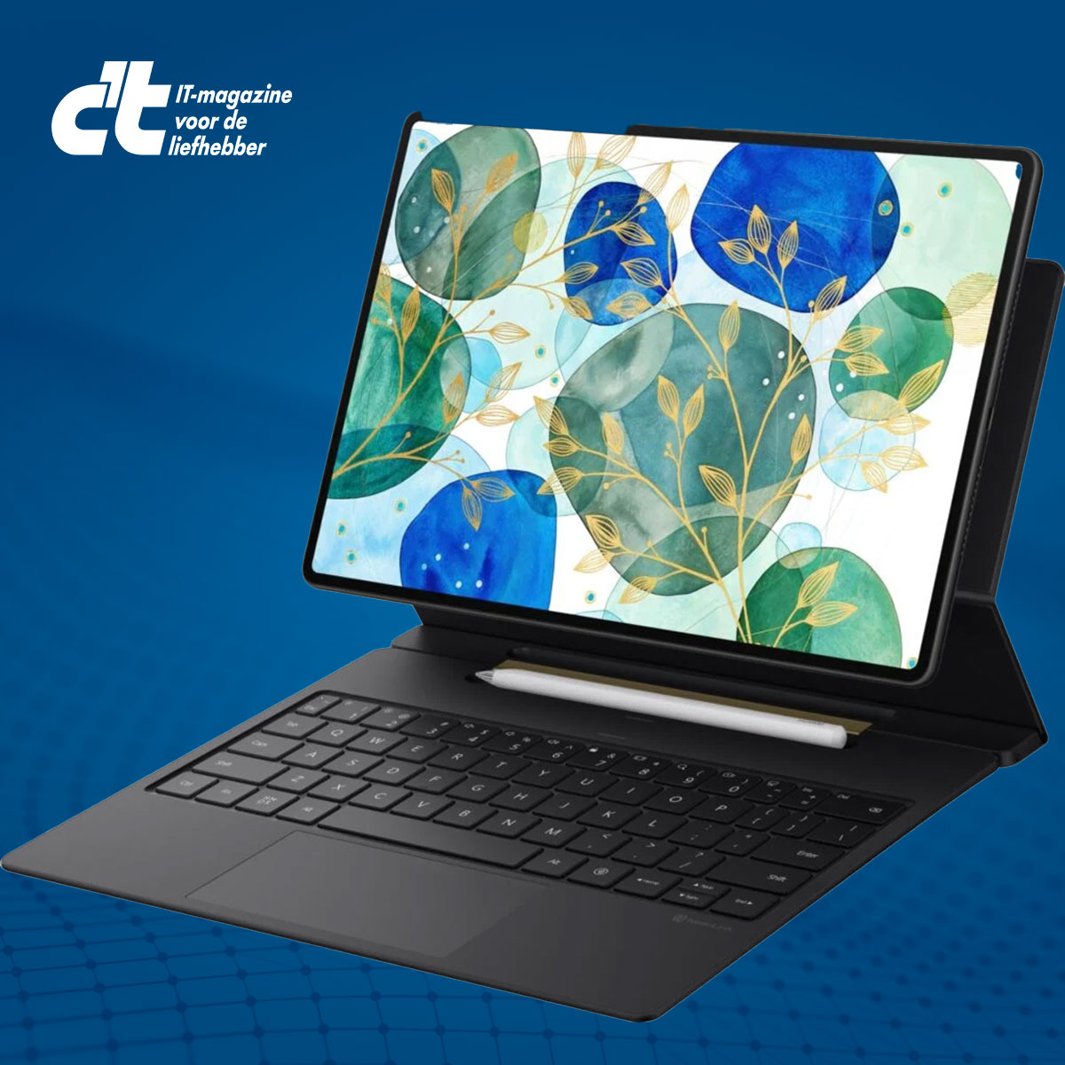 De cover maak je eenvoudig magnetisch los en vast en kan de tablet in vier standen vasthouden, twee rechtop en twee plat. In de achterste platte stand stand is de onderste rij toetsen (‘druk op de spatiebalk om te ontgrendelen’) en de trackpad nog zichtbaar. Het toetsenbord wordt automatisch opgeladen via de tablet en heeft een gleuf waarin ook de optionele M-Pencil 3 magnetisch vastklikt en draadloos opgeladen wordt. De pen kan in alle standen in de gleuf blijven liggen. Hij kost circa 100 euro, maar wordt volgens de site van Huawei tot 31 oktober 2024 gratis meegeleverd.