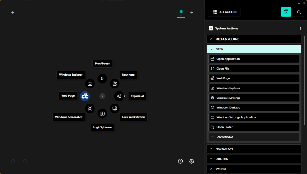 De Logi Marketplace biedt daarnaast uitbreidingen voor specifieke applicaties, waaronder Figma, Discord en Microsoft Flight Simulator. De configuratiesoftware blijft de centrale hub voor knoptoewijzingen, app-profielen en macro’s. Functies als Smart Actions en de AI Prompt Builder zijn aanwezig, maar nog niet te koppelen aan de Action Ring.