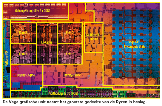 Alle Ryzen-cpu’s zijn voorzien van een SoC (Systems-on-Chip), die de basisfunctionaliteit van de I/O-hub verzorgt, zoals USB, SATA, PCI Express en HD-audio. Strikt genomen dient de chipset op het moederbord alleen maar als extra PCIe-switch die daarbij het aantal USB- en SATA-interfaces vermenigvuldigt. AMD heeft de I/O-hub van de combiprocessors gewijzigd ten opzichte van de hub voor cpu’s zonder graphics: in plaats van 24 PCIe 3.0-lanes zijn er nog maar 16 (zie het uitgebreidere artikel in c’t magazine 5/2018).