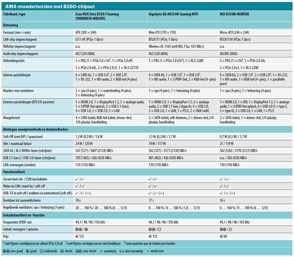 Het MSI B350M-MORTAR Micro-ATXmoederbord is een gunstig instapmodel voor een Ryzen 3 2200G- of Ryzen 5 2400G-systeem met Vega-graphics. De Asus ROG Strix B350-F Gaming is een moederbord in vol ATX-formaat voor rond de 125 euro en de GA-AB350N-Gaming WIFI van Gigabyte (vergelijkbare prijs) is geschikt voor een compacte pc met wifi in Mini-ITX-formaat. Alle geteste moederborden hebben ten minste vier SATA-6G-poorten, vier USB-3.0-aansluitingen en een M.2-poort voor PCIe-ssd’s.