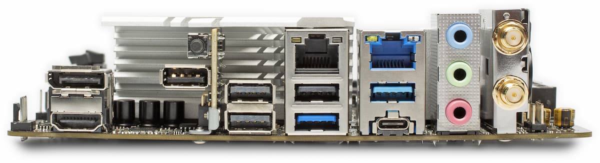 4K-monitoren kunnen worden aangesloten via één HDMI- en één DisplayPort-aansluiting. Naast vier USB 2.0- en twee USB-A-poorten met 10 Gbit/s is er ook een USB-C-poort voor randapparatuur. Die is geschikt voor USB 3.2 Gen 2×2 en haalt een snelheid van ongeveer 2 GB/s met een snelle externe ssd.