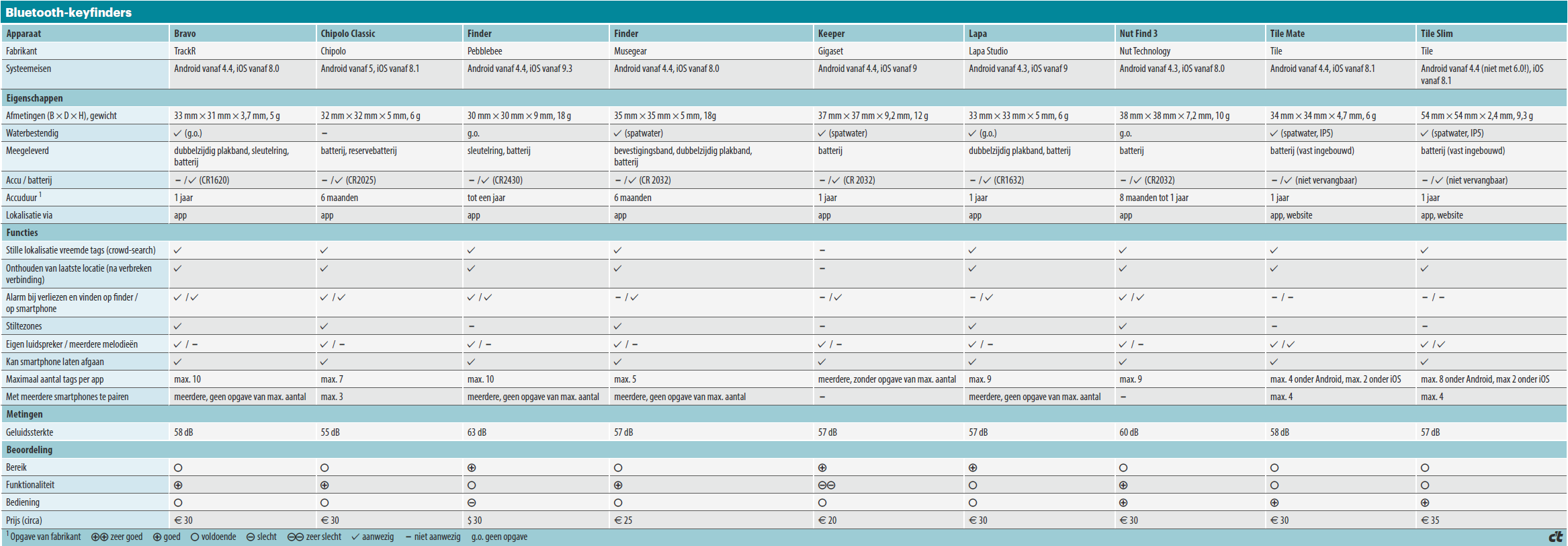 Hoewel de bluetooth-trackers met hun prijzen vanaf zo’n twintig euro niet erg duur zijn, verwachtten we een behoorlijke kwaliteit van de hardware en de app. Tot de betere exemplaren behoren de Nut Find 3 en de trackers van Tile. De Chipolo en Lapa stelden teleur door hun fragiele hardware. Gigaset levert een stevige behuizing, maar de app is matig. Geen van onze testkandidaten voldeed in alle opzichten.
