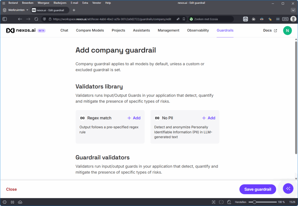 Voor veilig gebruik van AI kunnen beheerders Guardrails instellen. Naast Regex-filters bevat het platform een uitgebreide wereldwijde PII-detectielaag met herkenning van e-mailadressen, telefoonnummerformaten en andere generieke patronen. Sommige opties richten zich op Amerikaanse identifiers, maar de basisdetectie is internationaal toepasbaar. Voor organisatiespecifieke structuren kunnen aanvullende regex-regels worden ingezet. Wanneer in- of uitvoer botst met de ingestelde vangrails, kan gevoelige data worden vervangen door labels of kan de prompt worden afgewezen. Guardrails kunnen organisatiebreed of per model worden ingesteld, met prioriteiten of uitzonderingen.