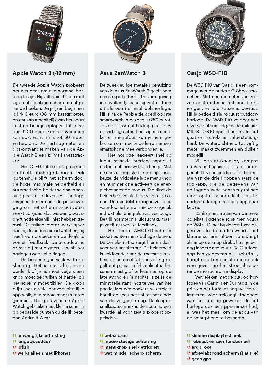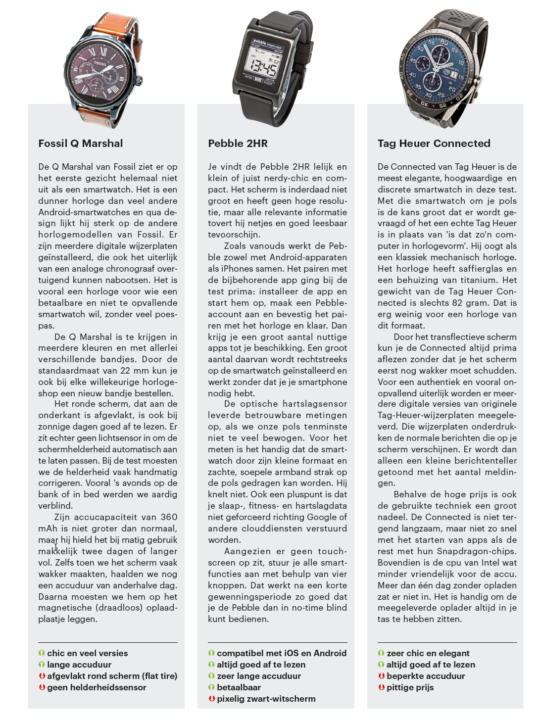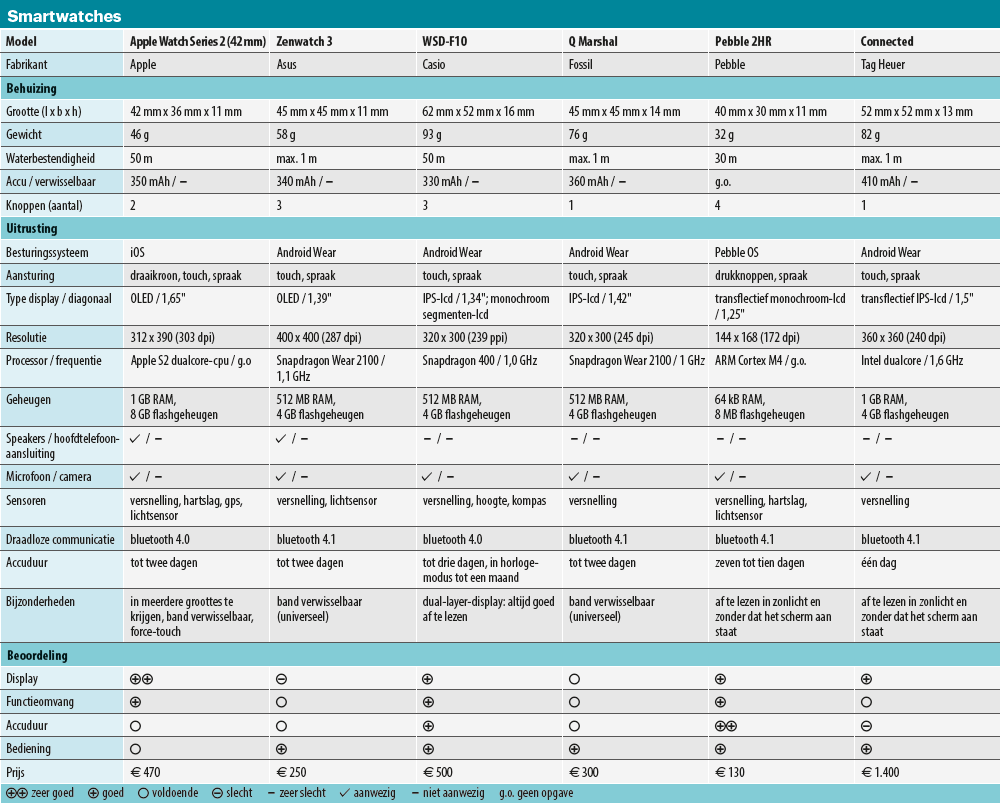 Dat alles hielden we in het achterhoofd toen we zes nieuwe smartwatches voor deze test in huis haalden. De Tag Heuer Connected zit in de nichehoek van klassiek, hoogwaardig afgewerkt en onopvallend. Casio gaat met zijn WSDF10 meer voor een hommage aan de GShock-modellen in de vorm van een robuust outdoor-exemplaar. Asus en Fossil hebben modellen die de charme hebben van analoge horloges en aantrekkelijk geprijsd zijn. Apple valt op met functies als hartslagmeting en een goede integratie binnen het eigen ecosysteem. Pebble, die de smartwatchtrend populair heeft gemaakt, kan niet achterblijven en doet mee met de nieuwe Pebble 2HR. We hadden ook graag de Gear S3 van Samsung aan de tand gevoeld, maar die kregen we niet op tijd binnen.
