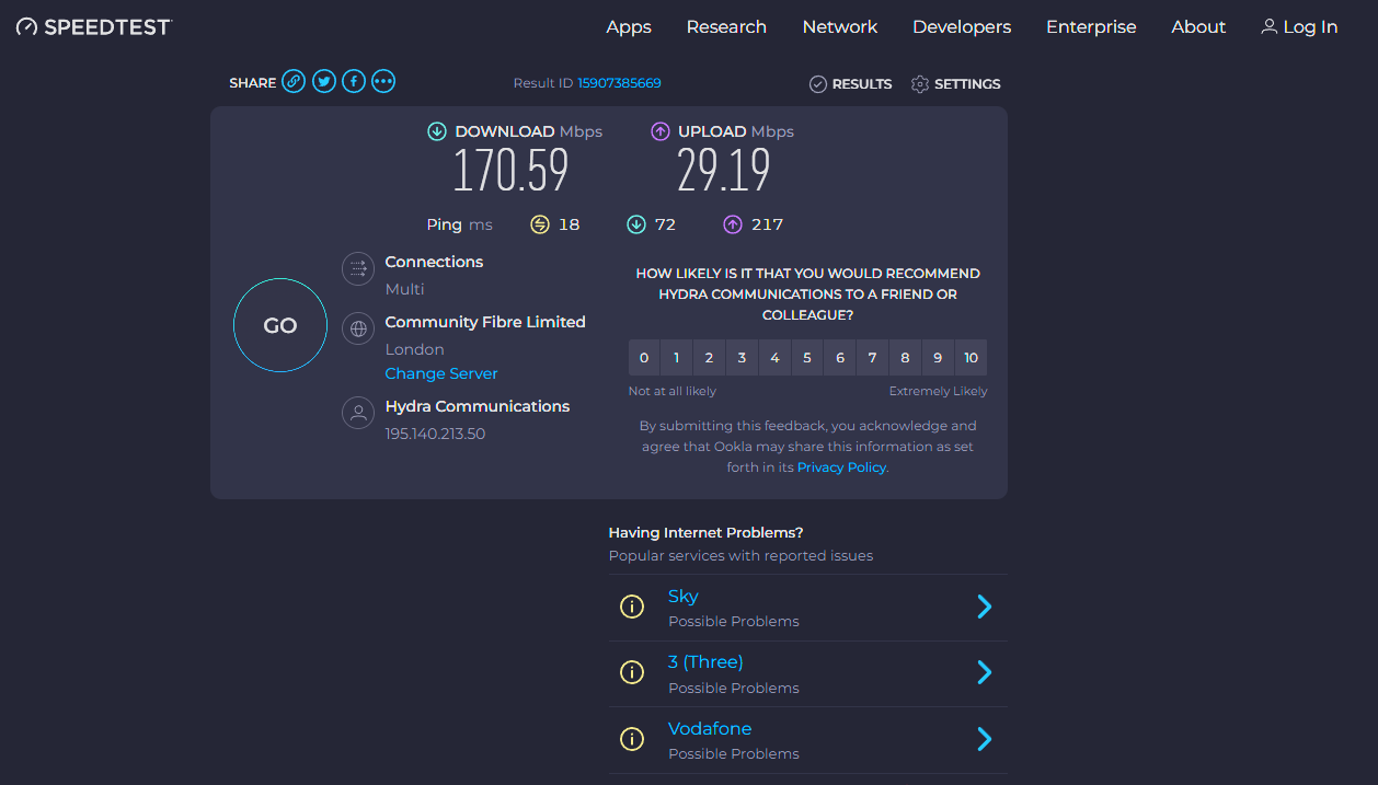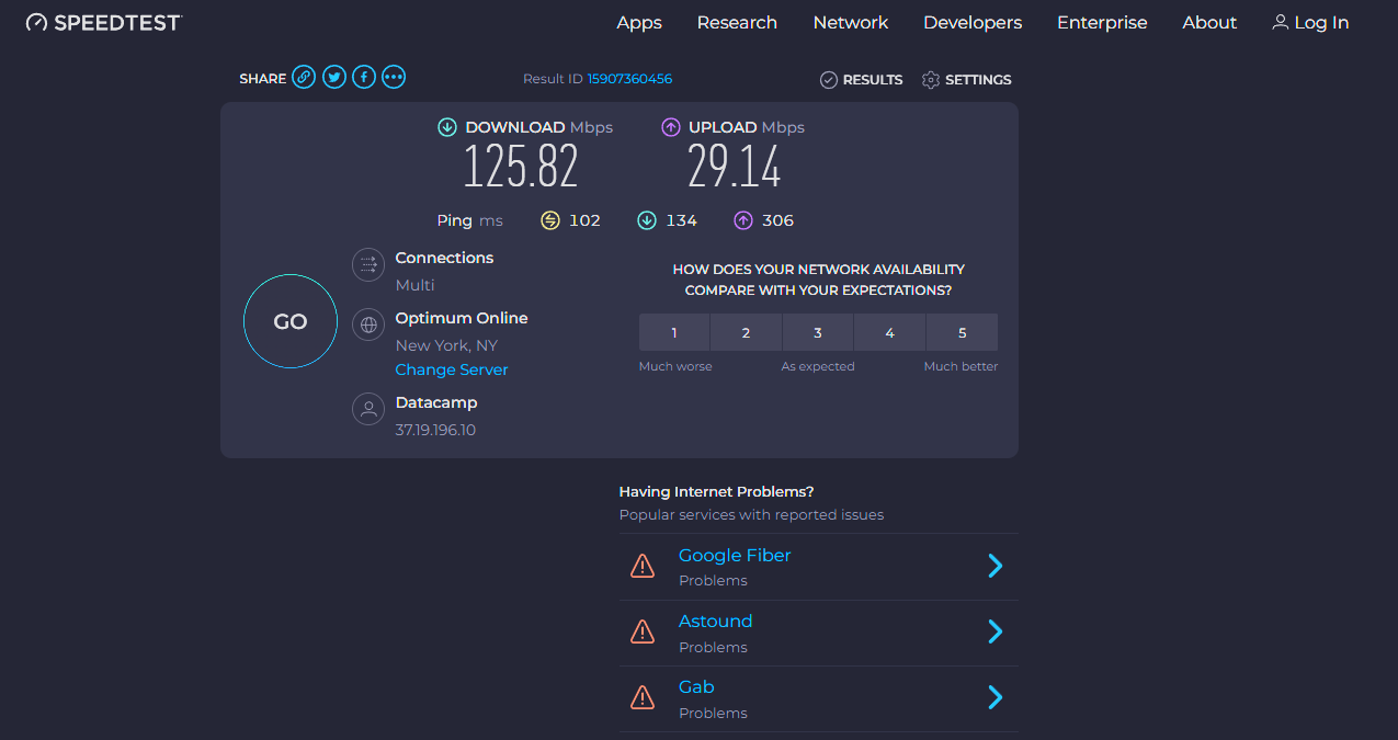 Zo behaalden we ongeveer 126 Mbit/s download- en 29 Mbit/s uploadsnelheid terwijl we verbonden waren met een server in New York. Bij een verbinding met een server in London behaalden we ongeveer een downloadsnelheid van 170Mbit/s en wederom een uploadsnelheid van 29 Mbit/s.