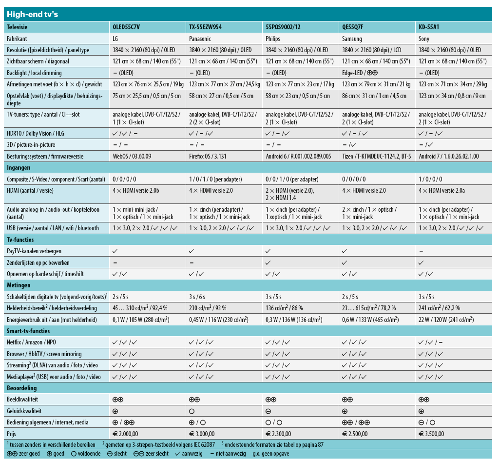 Wie een groot televisietoestel wil kopen, kan kiezen tussen toestellen van 500 tot 5000 euro. Bij de duurste televisies zitten 4K-toestellen die HDR-beelden (High Dynamic Range) weergeven, met spraak bediend worden, alle streamingdiensten en videokanalen direct via een app toegankelijk maken, de nieuwste displaytechnieken ondersteunen en nog veel meer spiffy features hebben. Bij het maken van een keus streep je weg wat je niet nodig hebt. Heb je bijvoorbeeld wel HDR nodig, kijk je naar 4K-content, welke tuners moet je televisie hebben, moet hij een goed geluid hebben of sluit je hem op je stereo-installatie of soundbar aan? In onze test van huidige toptoestellen lees je ook wat we van een luxe afstandsbediening verwachten.
