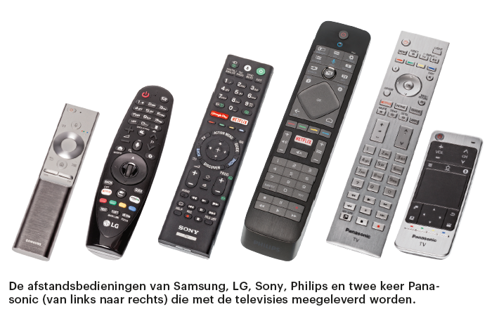 Behalve het menu van het besturingssysteem is de afstandsbediening van een televisie belangrijk voor een goede bediening. Samsung levert een zeer minimalistische afstandsbediening mee: alle belangrijke instellingen zitten onder de duim en er is een geïntegreerde microfoon aanwezig voor spraakbesturing. De aanzienlijk grotere afstandsbediening MagicRemote van LG heeft een ingebouwde gyroscoop waarmee je een muisaanwijzer op het scherm beweegt. Dit past bij de wat speelse WebOS- interface, maar je moet wel wennen aan de bediening. De duurdere toestellen van Panasonic en Sony worden geleverd met een conventionele afstandsbediening. De afstandsbediening van Sony is zeer onoverzichtelijk. Op de achterkant van Philips’ afstandsbediening zit een QWERTY-toetsenbord waarmee je teksten sneller kunt typen. Dat is handig, maar bijna achterhaald nu spraakherkenning zo ver gevorderd is.
