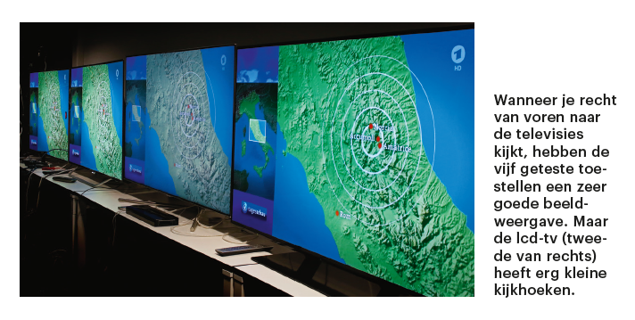 De achtergrondverlichting is ook het fundamentele verschil tussen een oled-tv en qled-tv. De pixels van een oled-tv bestaan uit organisch materiaal dat licht geeft wanneer er stroom op wordt gezet. Omdat elke pixel licht geeft, is er geen achtergrondverlichting nodig. In theorie kan een oled-tv een oneindig hoog contrast bereiken doordat elke pixel onafhankelijk van naburige pixels in- en uitgeschakeld kan worden. In de praktijk wordt het contrast beperkt door reflecties van het omgevingslicht. Bij een lcd-tv met quantumdots wordt de achtergrondverlichting tegengehouden door de vloeibare kristallen in de pixels, maar dat lukt niet voor honderd procent. Hierdoor is een zwarte pixel wel zwart wanneer je er van voren naar kijkt, maar grijs wanneer je er schuin naar kijkt. De qled van Samsung heeft van voren gezien een uitstekende kleurenweergave, maar de grote kijkhoekafhankelijkheid verbaasde ons telkens weer als we de testruimte binnenkwamen en de tv’s van opzij bekeken.
