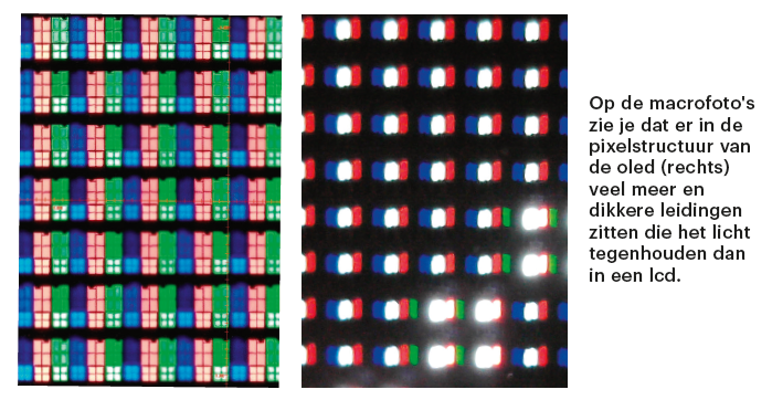 Bij oled-tv gaat een hogere lichtopbrengst altijd ten koste van de levensduur. Wanneer je het organische materiaal zwaarder belast, veroudert het sneller. Omdat de fabrikanten rekening met deze veroudering houden, laten ze de organische displays niet de lichtopbrengst van lcd’s bereiken. Bovendien zorgen ze er met een automatische functie in de toestellen voor dat het tv-scherm na enige tijd stilstaand beeld een zwarte schermbeveiliging met kleine bewegende symbolen of stippen activeert. In het geval van LG wordt die beveiliging al na twee minuten ingeschakeld. De beweging in de schermbeveiliging voorkomt dat lichte inhoud van het beeld op het scherm inbrandt wanneer die gedurende langere tijd op dezelfde plek wordt weergegeven. Het effect is vergelijkbaar met dat van de eerste plasmaschermen, maar de pixels branden niet in, maar uit: de aangetaste plekken verliezen hun lichtsterkte en verschijnen daardoor later als schaduwen in andere beeldinhoud. Een ander verschil zijn de kosten. Omdat het productieproces van lcd-tv’s al min of meer uitontwikkeld is en relatief goedkoop, zijn er al toestellen voor minder dan 500 euro te koop. Daarmee vergeleken zijn grote organische beeldschermen duur. Afhankelijk van het schermformaat en de uitrusting beginnen de prijzen van Full-HD oled-tv’s bij ongeveer 1200 euro en kosten 4K-oleds meer dan 2000 euro. Het prijsverschil wordt veroorzaakt door het duurdere organische materiaal en door het complexere productieproces. Zo moeten de organische lagen op een groot oppervlak, maar met een zeer fijne dosering op het substraat worden aangebracht. Als de dikte namelijk niet overal gelijk is, veranderen de helderheid en de kleur. Bovendien wordt elke pixel van een oled-scherm aangestuurd met vijf tot zeven transistors, terwijl er voor een pixel op een lcd-scherm maar één tot twee tft’s nodig zijn. Omdat er stroom op elke oled-pixel wordt gezet, moeten de leidingen op het display dikker zijn. Dat heeft een negatief effect op de lichtopbrengst, want waar die leidingen lopen, kan er geen licht door schijnen. Op de macrofoto van de pixelstructuur zie je de ondoorzichtige leidingen en transistors als zeer brede, donkere gebieden tussen de pixels.