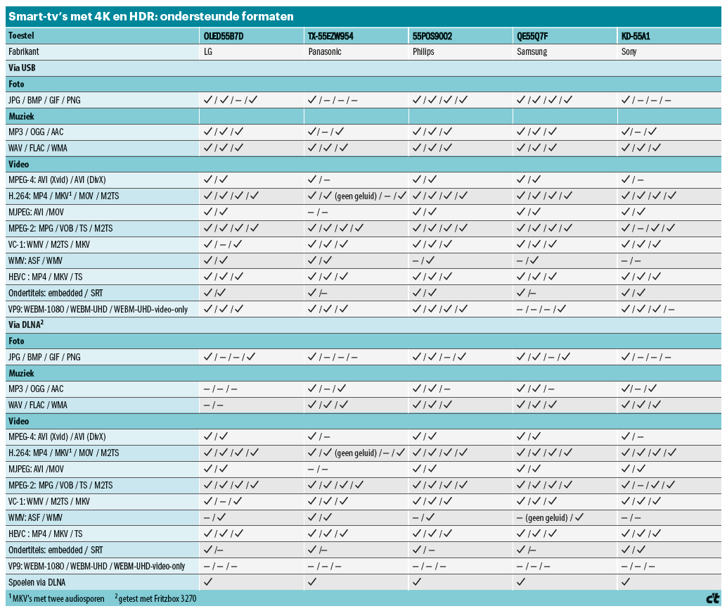 Alle vijf geteste tv’s hebben een 4K-resolutie en geven kleur- en contrastrijke HDR-inhoud weer. Terwijl het verschil tussen een 4K-resolutie en Full HD maar zichtbaar is tot een bepaalde kijkafstand van bijvoorbeeld maximaal drie meter bij een 55-inch tv, bemerk je de HDR-weergave ook op grotere afstanden. Als je een zeer grote woonkamer hebt maar geen groot tv-scherm wilt, raden we een tv aan die HDR ondersteunt. Alle HDR-tv’s hebben momenteel een 4K-resolutie, maar andersom is dat niet het geval. Momenteel wordt er nog niet veel HDR-content aangeboden, maar je vindt zulke video’s wel bij Netflix en op YouTube. Het is nog niet bekend wanneer Nederlandse tv-omroepen in 4K en HDR gaan uitzenden. Vier van de vijf televisies ondersteunen al het HLG-formaat (Hybrid Log Gamma) dat hiervoor gebruikt zal worden. De LG was het enige toestel dat ons HLG-testbestand niet afspeelde. De Samsung gaf aanvankelijk een foutmelding, maar speelde de HDR-film toch af. Aan de andere kant is LG momenteel wel de enige fabrikant die het dynamische HDR-formaat Dolby Vision ondersteunt. Sony is van plan zijn firmware aan het eind van het jaar daarmee bij te werken. In c’t 12, 2017 vind je meer informatie over het HLG-formaat.