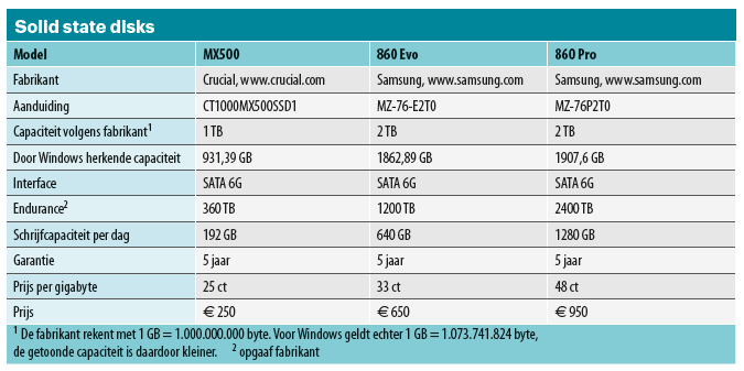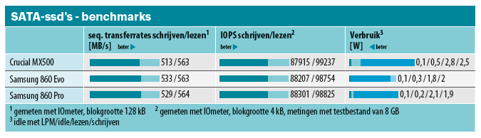 Crucial en Samsung waarderen vooral bestaande modellen op, maar dan wel goed. De verschillen tussen de drie modellen zijn klein. De MX500 heeft vooral de gunstiger prijs als voordeel, de 860 Pro heeft weer een zeer goede endurance. Maar de gehalveerde garantie ten opzichte van het vorige model kan wat klanten wegjagen. Bij de performance liggen de 860 Evo en 860 Pro dicht bij elkaar. Alleen bij modellen van 500 GB of minder is het de moeite waard om voor het Pro-model te gaan.