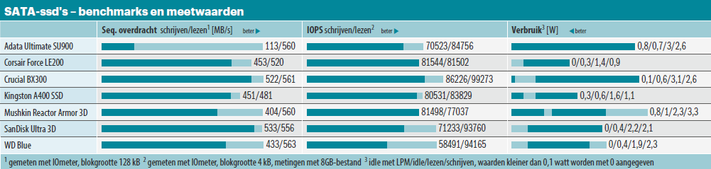Om die reden hebben we weer een aantal recente sata-ssd’s op de testbank gelegd. Dit keer mochten de Adata Ultimate SU900, Corsair Force LE200, Crucial BX300, Kingston A400 SSD, Mushkin Reactor Armor 3D en de redelijk identieke modellen van WD en SanDisk, de Blue en Ultra 3D, hun kunnen aantonen. Omdat schijven tegenwoordig alleen maar sneller vol lijken te lopen, zijn we voor een opslagcapaciteit van om en nabij 500 GB gegaan.