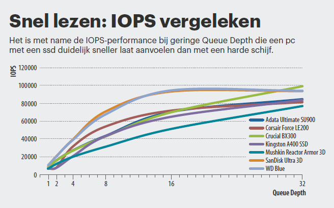 Zeer snelle harde schijven halen slechts een paar honderd IOPS. Maar zelfs de goedkoopste SSD’s halen moeiteloos tienduizenden IOPS. Fabrikanten strooien graag met hoge IOPS-getallen. In de praktijk maakt het echter niet uit of er 80.000 of 90.000 IOPS worden gehaald. Daarnaast worden deze waarden meestal bepaald met 32 parallelle acties. Als dat er minder zijn, zakken de IOPS-waarden in. Dit komt onder andere door het feit dat er minder flashchips parallel kunnen werken. Maar juist de IOPS bij geringe Queue Depth zijn belangrijk voor desktops en notebooks. Bij een Queue Depth van 1 halen de schijven waarden van maximaal 10.000 IOPS.