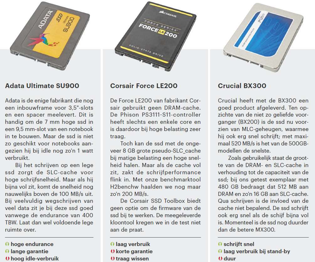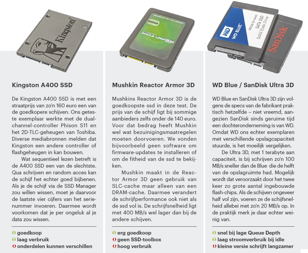 Mocht je al weten dat je ssd vrij vlot vol gaat raken, kies dan niet voor de Ultimate SU900 – of koop dan direct de 1 TB-versie. Zodra deze ssd’s namelijk vrij vol raken, zakt de schrijfsnelheid terug tot minder dan die van een harde schijf. De Reactor Armor 3D ondersteunt geen secure erase. Als je dus bang bent dat je gegevens in verkeerde handen vallen, kun je deze ssd het best laten voor wat het is. In notebooks zorgen de ssd’s van Adata en Mushkin door hun hoge idle-verbruik voor een iets kortere accuduur. Stop je ze in een desktop-pc, dan maakt dat niets uit.