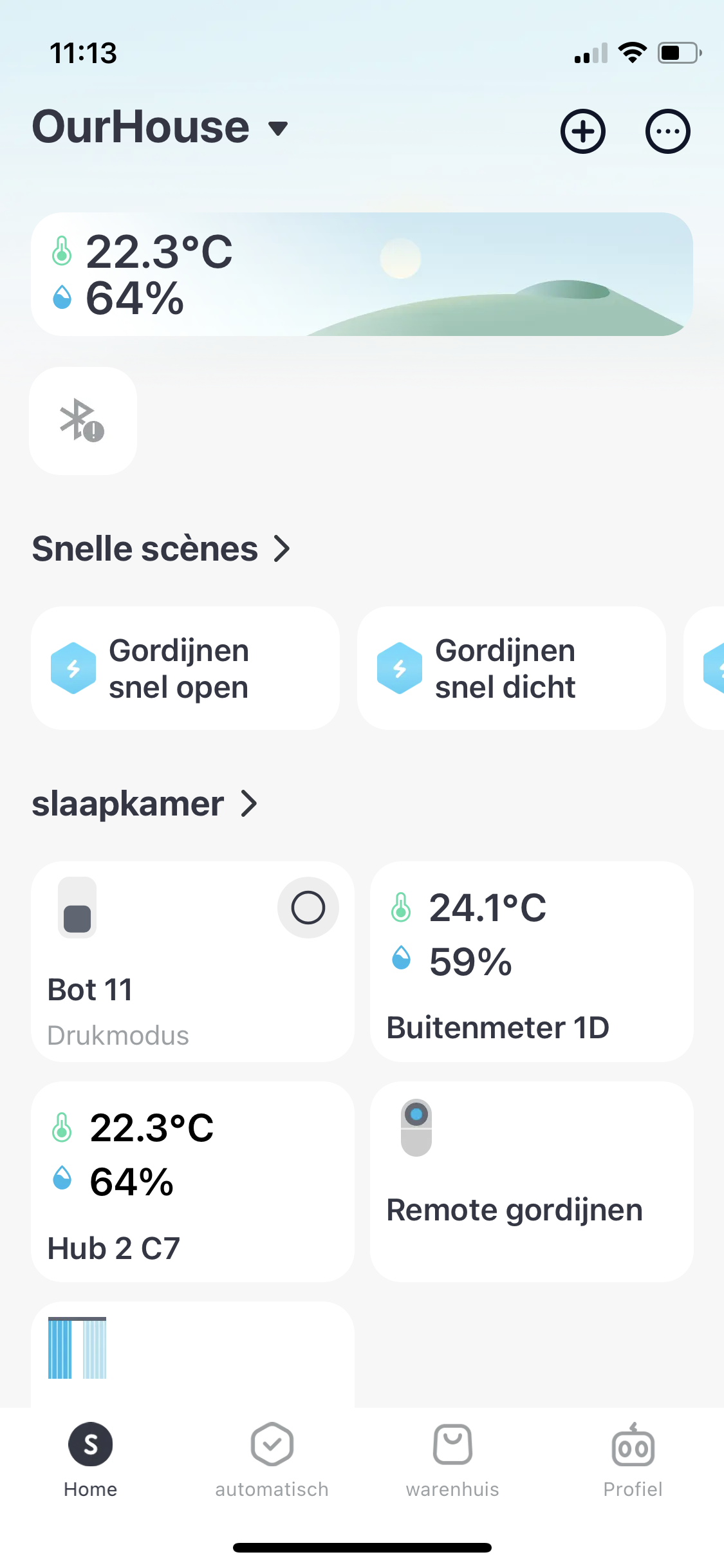Met de nieuwe SwitchBot Hub 2 (80 euro) kan dat weer wel. Sluit hem aan op de meegeleverde USB-C-voeding (met een temperatuur- en luchtvochtigheidssensor in de twee meter lange kabel) en voeg hem toe in de app. Je moet daarbij de wifigegevens intypen, maar dat werkt alleen met een 2,4GHz-netwerk. Je kunt dan scènes aanmaken op bijvoorbeeld tijd of zonsop/ondergang – daar is dan wel een globaal fysiek adres voor nodig – en daar een actie aan koppelen. Je kunt bluetooth op je telefoon dan eindelijk uitschakelen.