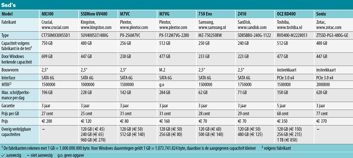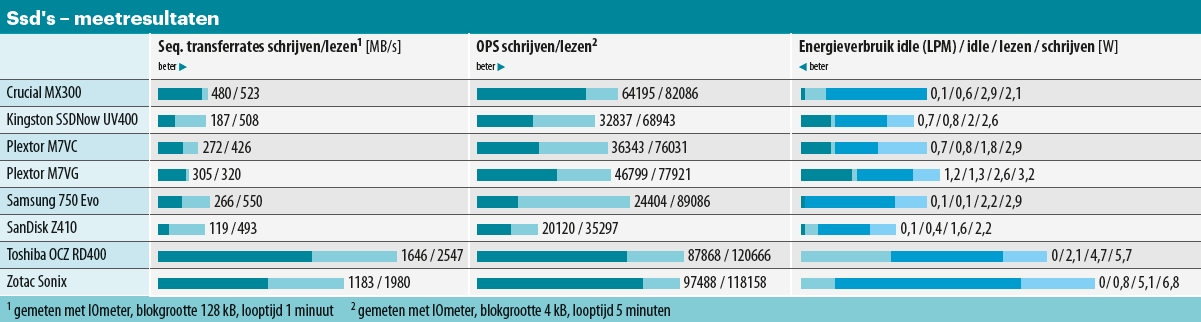 We hebben acht ssd’s in huis gehaald. De modellen met sata-interface zijn de Crucial MX300, Kingston SSDNow UV400, Plextor M7VC, Plextor M7VG, Samsung 750 Evo en de Sandisk Z49. De Toshiba OCZ RD 400 en de Zotac Sonix hebben een PCIe-aansluiting.