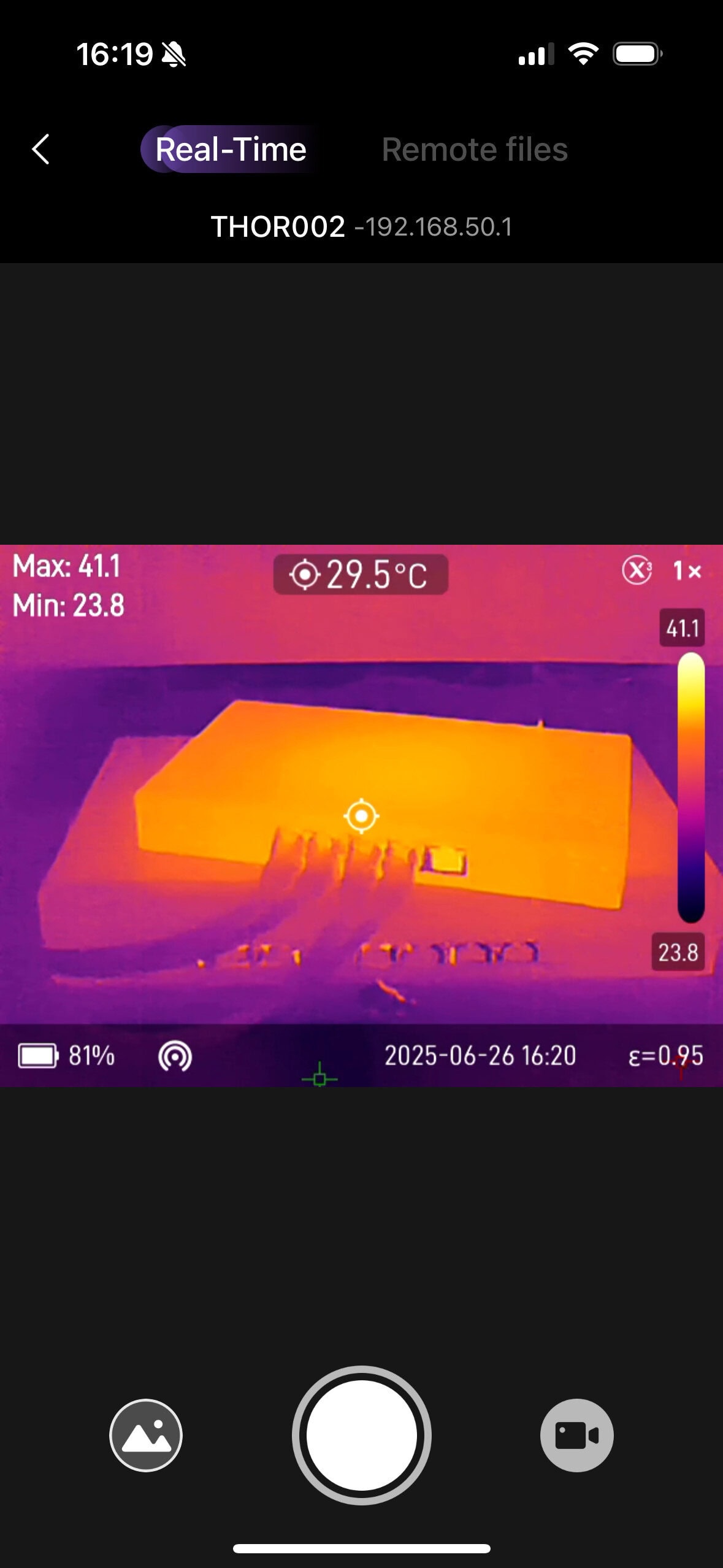 De Thermal Master Thor heeft geen bluetooth-functionaliteit, maar beschikt wel over een geïntegreerde wifi-module. Na activering worden netwerknaam en wachtwoord op het display getoond, waarna een mobiel apparaat direct verbinding kan maken. Voor Android is de benodigde app via een qr-code beschikbaar; iOS-gebruikers kunnen de app ThermalSmart downloaden via de App Store.