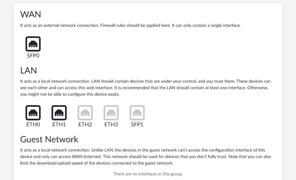Vervolgens koppel je de netwerkpoorten aan een functie als WAN of LAN, of voeg je een poort toe aan het gastennetwerk. Voor de WAN-aansluiting kun je IPv4- en IPv6-instellingen via DHCP laten toewijzen, als vast IP-adres instellen of verbinding maken met PPPoE. IPv6 kun je uitzetten, IPv4 niet. Je kunt overigens maar één poort als WAN-poort instellen; fail-over of load-balancing is dus niet mogelijk.