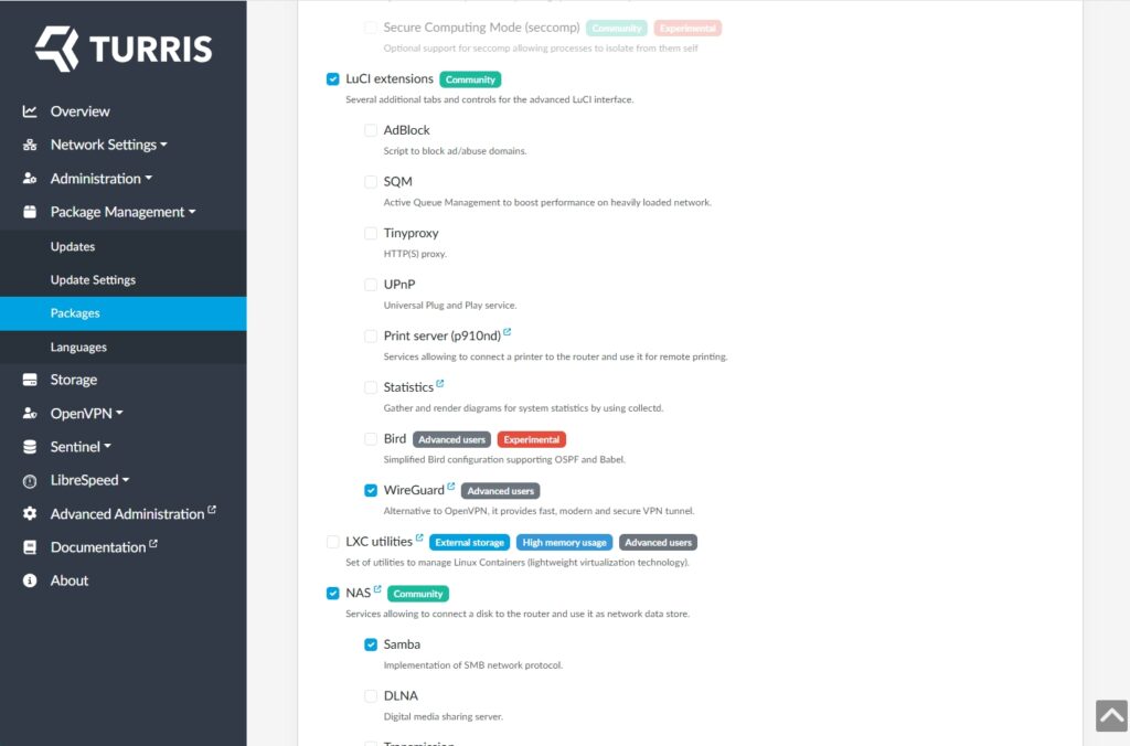 Niet alle packages hebben een integratie in de Turris-webinterface, daarvoor moet je doorschakelen naar de LuCi-interface van OpenWrt. Die laatste is duidelijk meer geschikt voor gevorderden, het grote voordeel van de Turris-apparaten is nu net het voor niet fulltime systeembeheerders wat overzichtelijkere Turris OS.