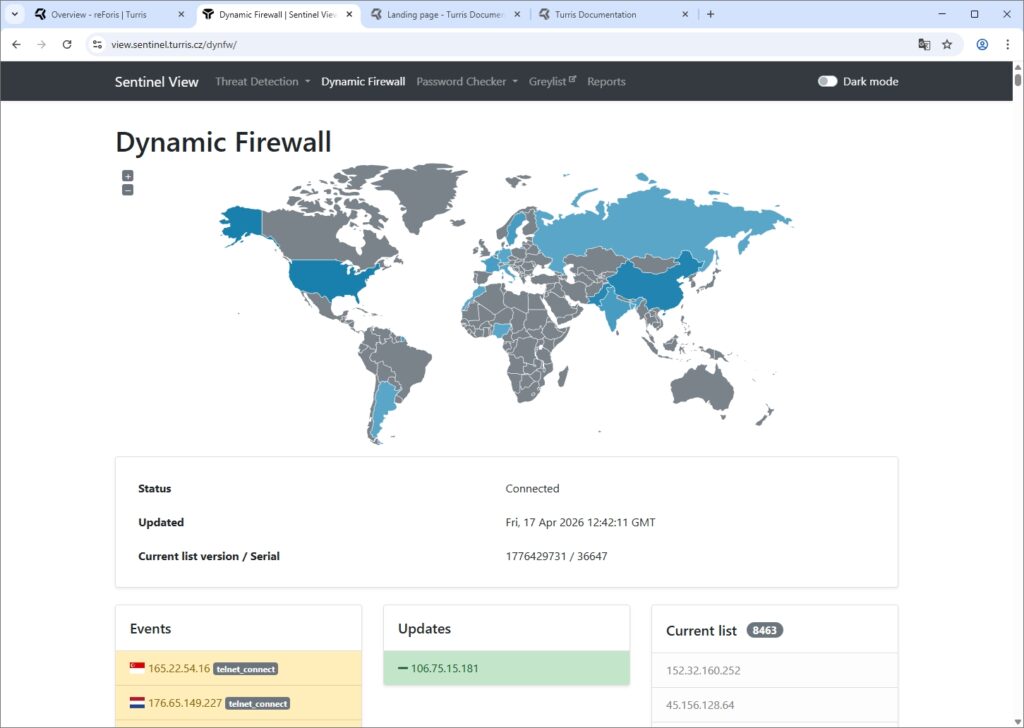 Turris Sentinel is een gedistribueerd systeem dat data verzamelt van alle Turris-apparaten. Dat betekent dat als op één router een aanval wordt gedetecteerd, dit aan Turris wordt gerapporteerd, waarna een nieuwe firewallregel wordt aangemaakt en naar alle andere routers wordt gestuurd.