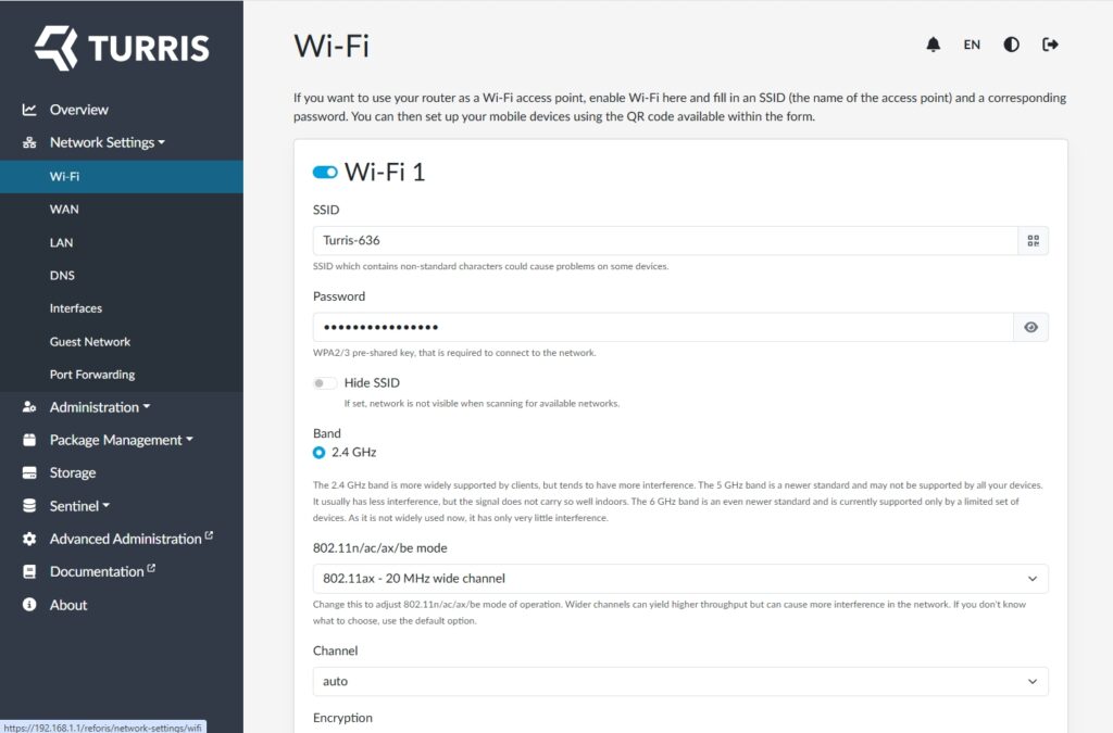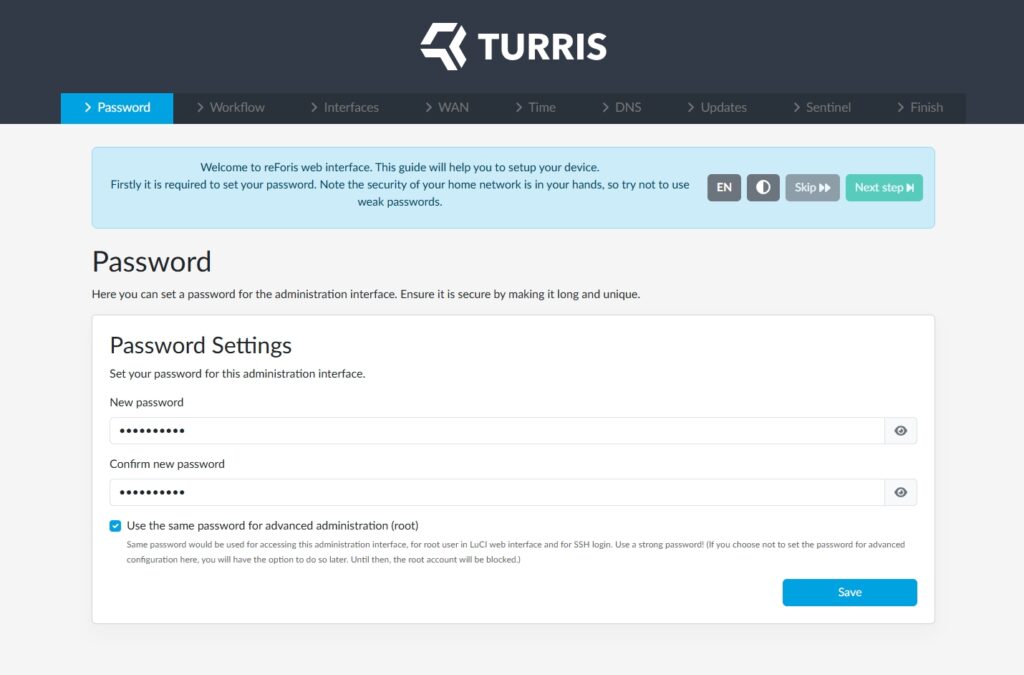 De router stelt zichzelf in op IP-adres 192.168.1.1; aangesloten netwerkapparaten krijgen een IP-adres uit dat segment. Met een browser kom je bij de eerste stappen van de configuratiewizard van de reForis-webinterface. Dat begint met het instellen van een administratorwachtwoord. Daarnaast kun je een geavanceerd wachtwoord (voor root) instellen of hetzelfde gebruiken.