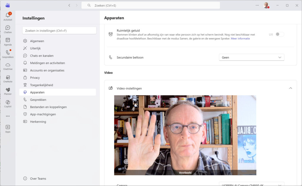 Als je je hand opsteekt, gaat de AI-gestuurde FineCam Pro-webcam van UGREEN je volgen. De autofocus werkt daarbij prima. Met een L-gebaar zoomt het beeld in. De beeldkwaliteit is uitstekend; de effectfilters voegen echter weinig toe. Meer over de UGREEN FineCam Pro 4K webcam lees je in deze review.