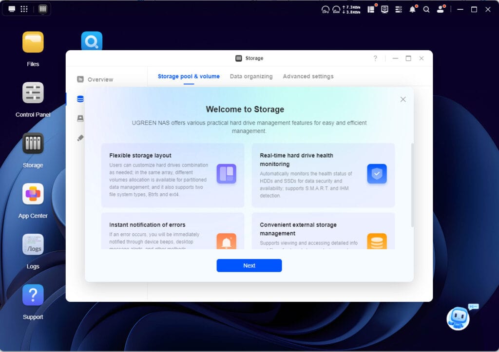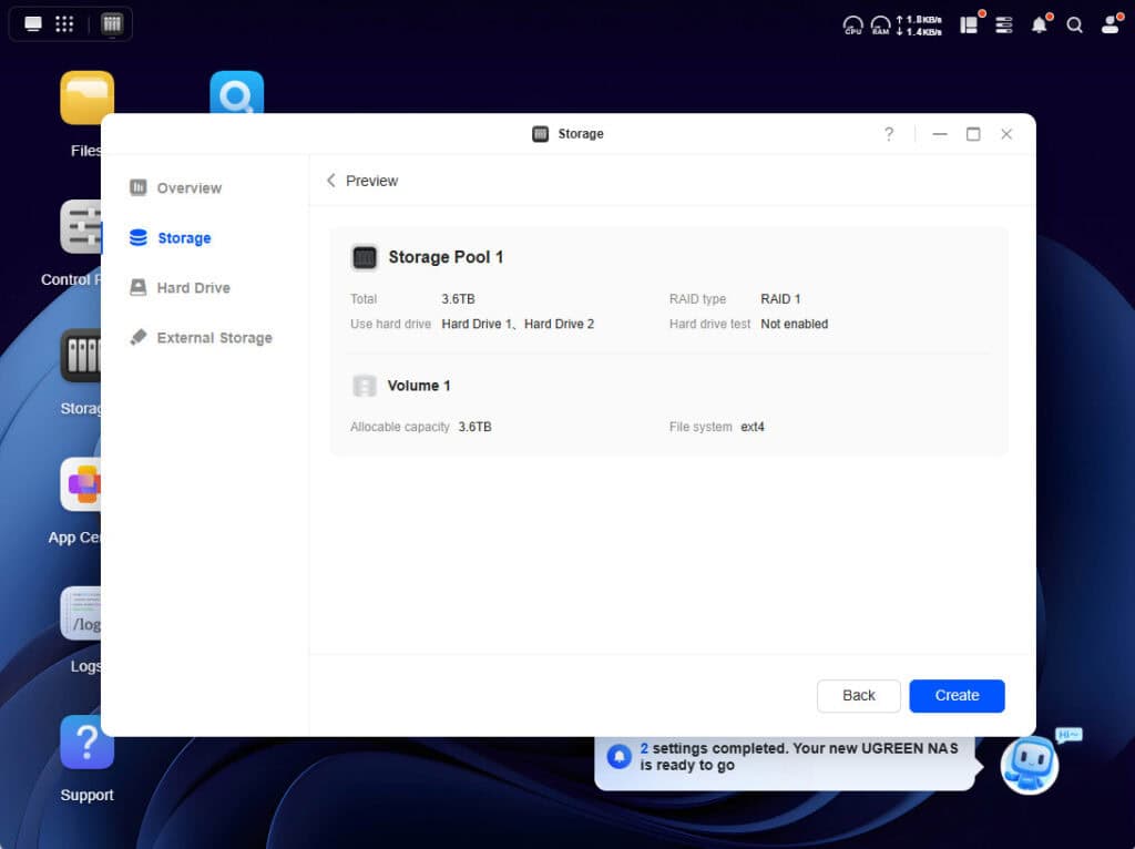 Daarna begint het initialiseren. Omdat het besturingssysteem niet op een van de schijven komt te staan, is dat proces binnen een minuut afgerond. Je komt dan in de webinterface van UGOS Pro terecht. Dat is UGREENs eigen besturingssysteem, waarbij goed is gekeken naar hoe de concurrentie, en dan met name Synology, dat aanpakt.