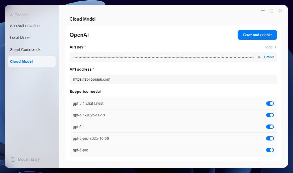 Met de app AI Console kun je de lokale AI-modellen beheren en meer modellen toevoegen. Je kunt bijvoorbeeld met een OpenAI-API de LLM’s van OpenAI gebruiken. Met AI Console geef je ook toestemming om de AI te laten zoeken in bijvoorbeeld films, series en muziek op de NAS. Ook kun je Docker-images downloaden en containers aanmaken en gebruikersinformatie opvragen.