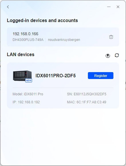 De app herkent de NAS vanzelf en je kunt hem dan registreren. Dat houdt in dat je hem een naam geeft (maximaal 15 tekens) en een administratoraccount aanmaakt. Om de NAS van overal te kunnen benaderen, moet je een mailadres en verificatiecode opgeven, die je binnen 10 minuten moet invullen, maar dat kan ook later nog.