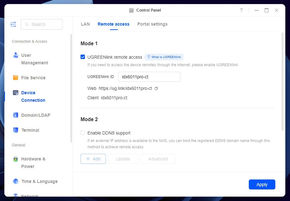 Je kunt de UGREEN-NAS met een browser beheren via de webinterface, maar dan alleen in het lokale netwerk of als je de juiste poorten in de router hebt opengezet. Er is echter ook een mogelijkheid voor beheer op afstand via Device Connection in het Control Panel, op het tabblad Remote Access.