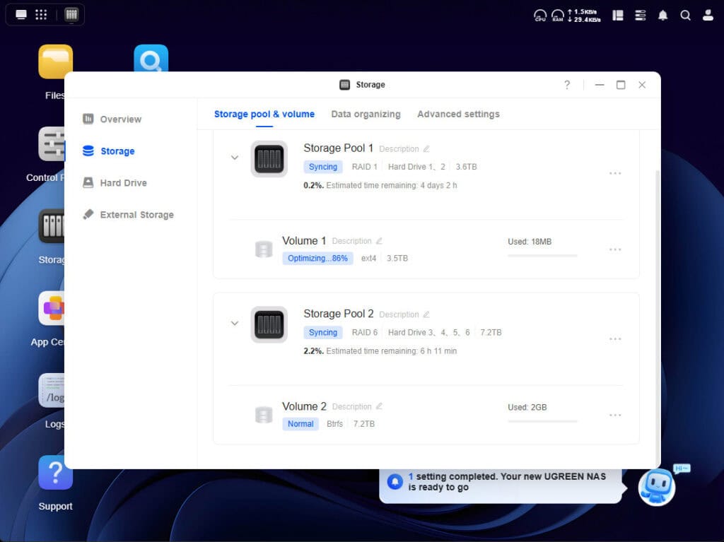 We kozen voor een RAID 1 op twee schijven met ext4 als bestandssysteem en voor een RAID 6 met Btrfs, voor meer instellingsmogelijkheden. Daarna gaat de UGREEN-NAS aan de slag met het optimaliseren van de volumes – dat kan een paar uur duren.
