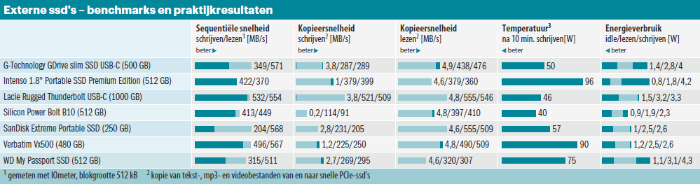 Externe ssd’s die USB 3.1 met Superspeed+ ondersteunen zijn net een tikkeltje sneller, waarbij de beperkende factor vaak de snelheid van de ingebouwde ssd is. Bij de test haalden vijf van de zeven schijven leessnelheden van boven de 500 MB/s. Meer dan dat mag je van een sata-ssd niet verwachten.