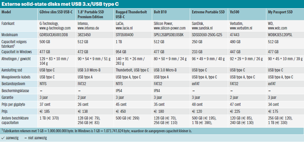 We hebben zeven modellen externe ssd verzameld: de G-Technology G-Drive Slim SSD USB-C, de Intenso 1.8″ Portable SSD Premium Edition, de LaCie Rugged Thunderbolt USB-C, de SanDisk Extreme Portable SSD, de Silicon Power Bolt B10, de Verbatim Vx500 en de Western Digital My Passport SSD. Die hebben allemaal een USB-B- of USB-C- aansluiting.