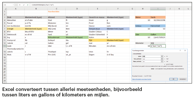 Met de functie CONVERTEREN(cel;meeteenheid;meeteenheid) rekent Excel om tussen meeteenheden. Hij vereist drie argumenten: de te converteren waarde, de bijbehorende meeteenheid en de meeteenheid waarnaar geconverteerd moet worden. De meeteenheden (zie afbeelding voor voorbeelden) moeten tussen aanhalingstekens geplaatst worden. Zo zet de formule =CONVERTEREN(H13;"km";"mi") de afstandswaarde in cel H13 om van kilometers naar mijlen.