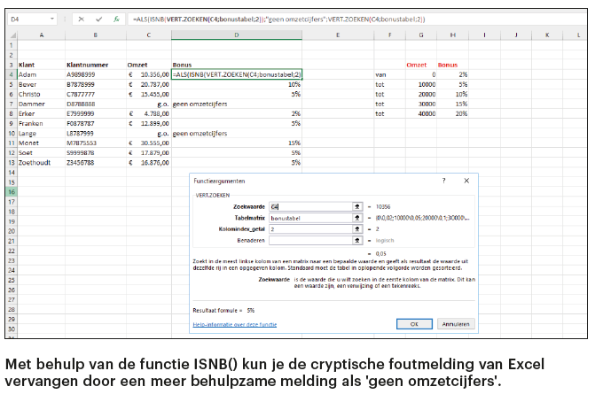 Bij twee van elkaar onafhankelijke lijsten is de functie VERT.ZOEKEN(zoekwaarde;zoekbereik;kolom) erg praktisch. Maar als die een waarde niet vindt, toont Excel normaliter de foutmelding ‘#NB’. Door dit te ondervangen met ISNB kun je de standaardmelding vervangen door een eigen tekst, waar de gebruiker meer aan heeft. De volledige formule wordt dan bijvoorbeeld =ALS(ISNB(VERT.ZOEKEN(C4;bonustabel;2));"geen omzetcijfers" ; VERT.ZOEKEN(C4;bonustabel;2)). Het is vaak zinvol om op bepaalde fouten te reageren. Met de functie TYPE.FOUT(foutwaarde) kun je het type fout bepalen en die met behulp van andere functies op verschillende manieren afhandelen. Deze functie levert voor elk fouttype een ander getal terug: #LEEG! = 1, #DEEL/0! = 2, #WAARDE! = 3, #VERW! = 4, #NAAM? = 5, #GETAL! = 6, #N/B = 7; al het andere levert #N/B.