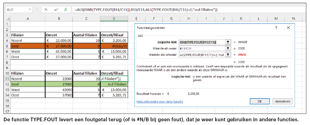 Komt op een werkblad een deling door nul voor, dan kun je die melding vervangen door een tekst als ‘geen gegevens’. Dat is bijvoorbeeld handig als je een formule doorvoert naar andere cellen, waarbij sommige geen volledige brongegevens hebben. Dat wordt op deze manier netjes aangeduid. Delen door nul wordt gedetecteerd als fouttype 2. In combinatie met de functies ALS() en ISNB kun je ongeldige gegevens als volgt aangeven: =ALS(ISNB(TYPE.FOUT(B11/ C11));B11/C11;ALS(TYPE.FOUT(B11/ C11)=2;"nul filialen")). Daarbij voert =ALS(ISNB(TYPE.FOUT(B11/C11));B11/C11) de berekening normaal uit als er geen fout is. Als er wel een fout is en die is van het type 2 dan schrijft ALS(TYPE.FOUT(B11/C11)=2;"nul filialen") de tekst “nul filialen” in de cel.