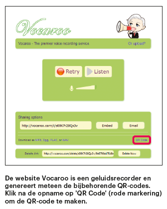 Houd er wel rekening mee dat bij dit soort koppelingen ook een internetverbinding nodig is. Dit in tegenstelling tot de QR-codes met alleen tekst. Het gekoppelde audiobestand kun je zelf online zetten, bijvoorbeeld bij Dropbox. Of je gebruikt een webdienst die je het werk uit handen neemt. Bij vocaroo.com kun je korte audiofragmenten opnemen en meteen (bij ‘Sharing options’) de bijbehorende QR-code genereren. Vanuit de scanner-app moet later wel doorgeklikt worden om naar de website te gaan en de weergave te starten. Dus voor heel jonge kinderen is dit minder geschikt.