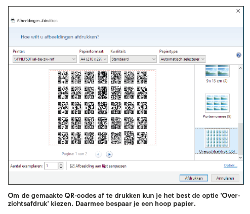 Om de code later bij het inscannen probleemloos te herkennen, moet die voldoende groot worden afgedrukt. Twee centimeter per zijde is het minimum voor eenvoudige patronen, complexere codes moet je groter afdrukken. Onder Windows 10 kun je het best de optie ‘Overzichtsafdruk’ kiezen om zo veel mogelijk QR-codes op een vel papier te printen. Let erop dat je de optie ‘Afbeelding aan lijst aanpassen’ uitvinkt, anders worden de QR-codes afgesneden en onleesbaar.