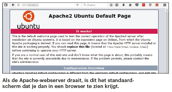 In principe ben je dan al klaar. Als je met een browser naar het ip-adres van je server gaat of naar de url van een domeinnaam die je aan het ip-adres hebt gekoppeld, moet de standaardpagina van Apache2 verschijnen. Eventueel kun je zelf nog zaken toevoegen zoals een databaseserver, SSL-certificaat of beheerinterface voor meer mogelijkheden, gebruiksgemak en veiligheid.