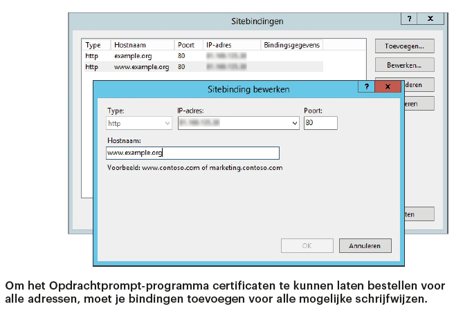 Een voorwaarde voor het gebruik van certificaten met één druk op de knop is de koppeling van websites aan een of meerdere hostnamen. Open het IIS-beheer en navigeer naar je website. Klik in de rechterkolom op ‘Bindingen’ en klik dan dubbel op het eerste ip-adres. Typ in het nieuwe venster een hostnaam in en sluit het venster. Dat moet je herhalen voor alle varianten van je domein waarmee je van buitenaf bereikbaar wilt zijn. Vul daarbij je eigen gegevens in, in plaats van www.example.org en example. org. Download dan de laatste versie van letsencrypt-win-simple en pak het zip-bestand uit in een map buiten de gebruikersmap – anders werkt de geplande taak later niet.