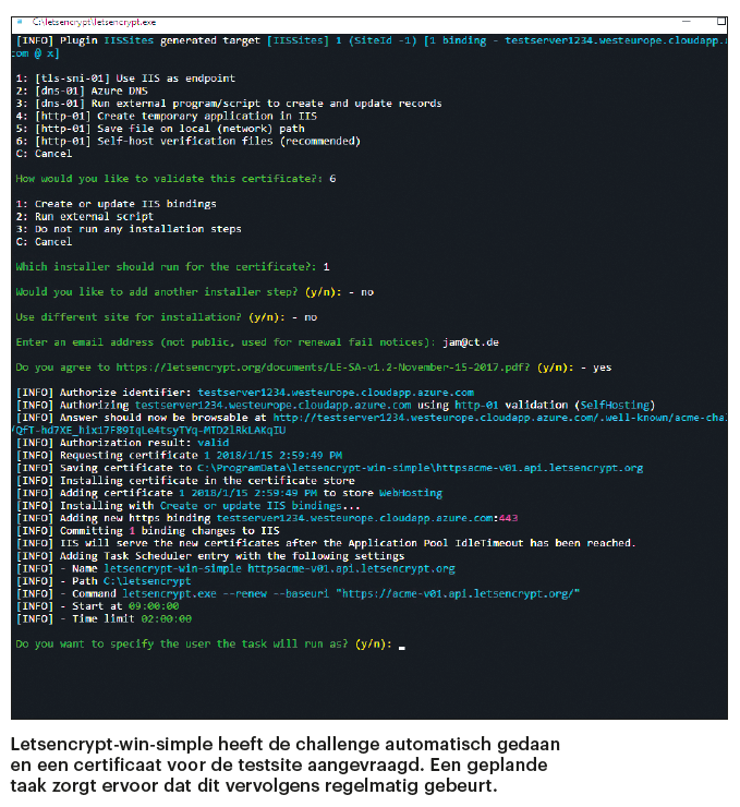 Met optie ‘6’ (http-01) voer je de taak uit zonder dat er verder wat ingesteld wordt, waarbij de data voor het uitvoeren van de challenge in de websitemap gezet worden. Bij de volgende stap kun je het certificaat aan IIS laten toevoegen en een binding voor poort 443 maken. Selecteer daarvoor optie ‘1’. Met optie ‘2’ kun je automatisch een eigen script laten uitvoeren om het nieuwe certificaat bijvoorbeeld aan een ander programma te geven. Als je geen andere scripts wilt instellen, kies je bij de volgende stap ‘n’. Het programma vraagt dan nog een keer of je nog meer websites wilt toevoegen, maar ook die stap kun je met ‘n’ beantwoorden. Dan wordt gevraagd naar een e-mailadres. Dat staat later niet in het certificaat en wordt niet openbaar gemaakt, maar dient alleen voor foutmeldingen als er wat verkeerd gaat. Bevestig de licentievoorwaarden van Let’s Encrypt met ‘y’ en kijk vervolgens hoe het programma zijn werk doet en het ene na het andere certificaat bestelt.