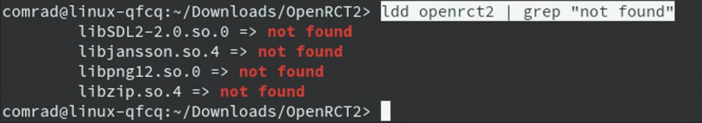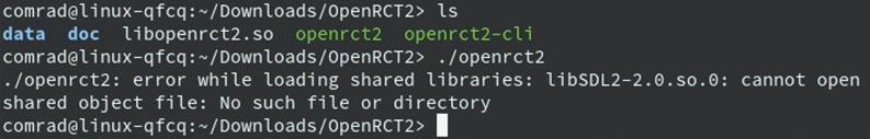 Bij andere distributies of openSuse-versies kunnen andere bibliotheken of versies hiervan ontbreken. Ook Ubuntu vormt hierop geen uitzondering. De handelswijze is bij allemaal in principe hetzelfde. Je gebruikt alleen de package-manager van de betreffende distributie. Het spel hoeft na het downloaden alleen uitgepakt en met het uitvoerbare bestand gestart te worden. Lukt dat niet, open dan een terminal, ga naar de directory van OpenRCT2 en start het spel met het commando ./openrct2. Een foutmelding verraadt dat voor het starten van het spel het bestand libSDL2- 2.0.so.0 nodig is, maar niet gevonden wordt.